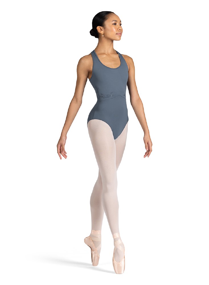 Scoop Neckline Strap Detail Tank Leotard Fabric: Main: 90% Nylon, 10% Spandex Contrast: 90% Nylon, 10% Spandex Mesh