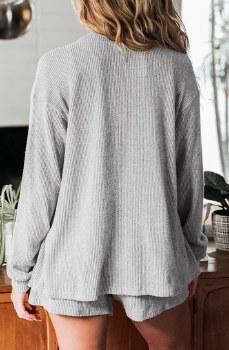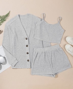 A cardigan, crop camisole and matching shorts all cut from softly ribbed fabric. This 3pcs lounge set is flattering and cozy fit. Stylish cardigan for added warmth and style. Perfect loungewear set for relaxing and lounging.